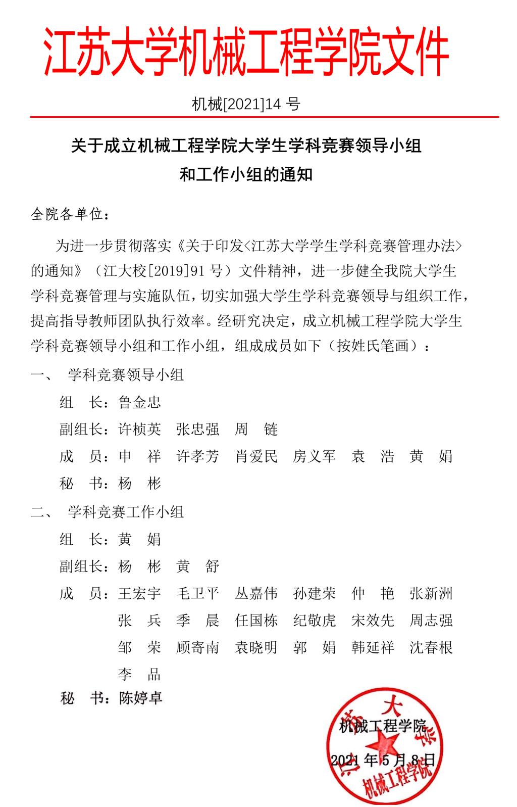 关于成立yl6809永利检测中心大学生学科竞赛领导小组和工作小组的通知(机械[2021]14号)