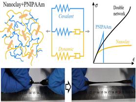 智能水凝胶是通过一定的物理或化学交联方式聚合形成网络凝胶的亲水聚合物,可以像生物体一样感知温度、光、电、化学或磁等外届能量场的微小刺激并伴随着宏观可逆的体积相变。利用温敏水凝胶弱刺激强响应的智能特征可实现热能向机械能的能量转化,在仿生软体机器人、驱动器、柔性传感器等领域具有巨大的应用潜能。但是温敏水凝胶脆弱的本质限制了其使用范围,大量研究证明于共价交联温敏水凝胶中引入纳米粘土颗粒以形成动态网络,可以大幅度改善其拉伸强度和韧性,但混合动态-共价聚合物网络对温敏水凝胶粘弹性的作用在很大程度上仍然未知。