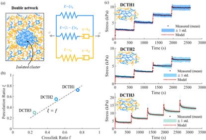 研究发现磁性双网络温敏水凝胶DCTHn的双重网络并不遵循简单的动态网络与共价网络混合规则,两个网络之间存在更复杂的力传递作用,存在部分渗入共价键,尽管这些共价键是永久性的,但能够随着时间的推移而松弛,其特征时间与动态(纳米粘土)网络相似。