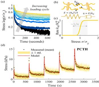 论文首先构建了基于纳米粘土的磁性物理交联温敏水凝胶PCTH的非线性粘弹性本构模型,指出该动态网络会以特定的速率kd动态解离和重新组合,值得注意的是该速率并非恒定的,而是随应力增加而增加。