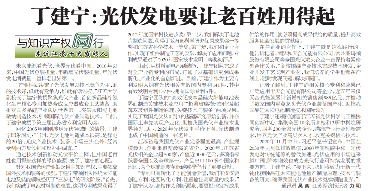 yl6809永利官网集团丁建宁教授光伏发电技术在江苏经济报报道