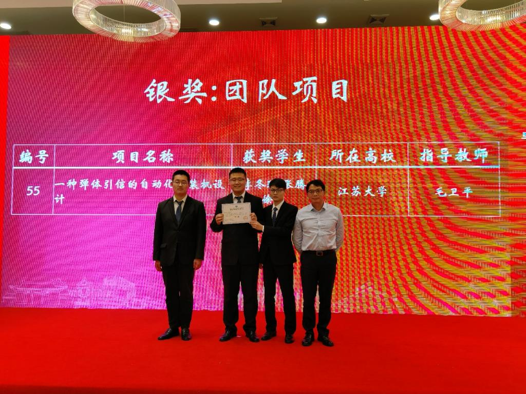 我校yl6809永利检测中心毛卫平、任国栋老师指导的张腾、李冬琪和徐怀同学的毕业设计作品《一种弹体引信的自动化组装机设计》,获得本届大赛唯一的团队项目银奖,并同时暂获最具商业价值奖(全国5项)。