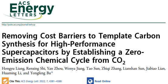 近日,yl6809永利检测中心/先进制造与现代装备技术工程研究院在国际知名期刊ACS Energy Letters (SCI一区,影响因子23.991)上发表题为“Removing Cost Barriers to Template Carbon Synthesis for High-Performance Supercapacitors by Establishing a Zero Emission Chemical Cycle from CO2”(ACS Energy Lett. 2022, 7, 4381-4388)的文章。该文章基于CO2构建一个零排放的化学循环,实现了MgO模板的循环使用(包括其溶解与再生)及高比表面积模板碳的绿色合成,有效地解决了模板碳(TC)合成的成本及排放问题,即:仅输入CO2、H2O和Mg即可输出形貌、孔结构、电导率高度一致的高性能电容碳(其他为可再利用的母液),在CO2减排和清洁能源应用间,建立了新的纽带。以对称模板碳电极组装的电容器在水系(KOH/H2O, >154 F g-1)或有机(Et4NBF4/AN,>140 F g-1)和离子液体(EMIMBF4,>178 F g-1)电解液中都表现出优异的电容和倍率性能;器件最大能量密度达17 Wh kg−1,明显高于传统超级电容器(< 10 Wh kg-1)。无论在水系还是有机/离子液体中,也都表现出良好的循环稳定性,20000次充放电后,电容保持率高于90.5%。