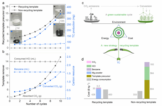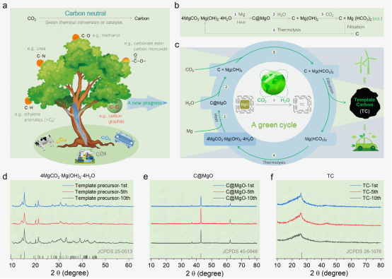 自党中央提出“双碳”目标,各行业拟实现该目标的出路,总结起来有两条:(1)减排CO2;(2)吸收/转化CO2。对于新能源行业,将CO2转化为碳电极材料是一个潜在机遇;因为碳材料已被广泛地用作各种储能器件的电极材料,如锂电池、超级电容等。CO2可以转化为各种高附加值产品,但前提要求其转化工艺“绿色、零排放、低成本”,否则与碳中和目标背道而驰。因此,将CO2转化为碳电极材料也必须满足这一前提。然而,目前最常用的活性炭材料,需要“碳化-活化-纯化”工艺来制备,不仅不消耗CO2,还排放大量CO2和废液。基于CO2合成碳材料的进展表明:无论使用LiAlH4还原,还是Mg粉与CO2直接反应,生成的碳材料比表面积都较低,不利于提高超级电容器容量。然而,传统非循环MgO模板法合成的模板碳:高比表面积、高电导率,非常适用于超级电容器,但以毒性较高的苯为碳源,使用HCl去除模板、模板不能回收,导致模板碳合成的原料和环境成本居高不下,阻碍其规模化应用。