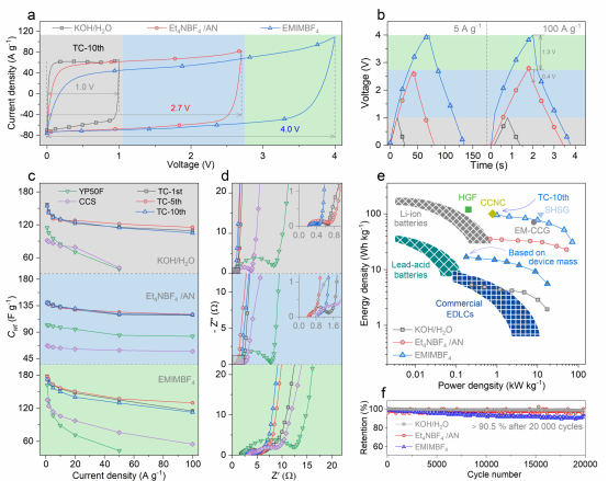 图4. TC-10th在KOH/H2O、Et4NBF4/AN和EMIMBF4电解液中的电容性能。