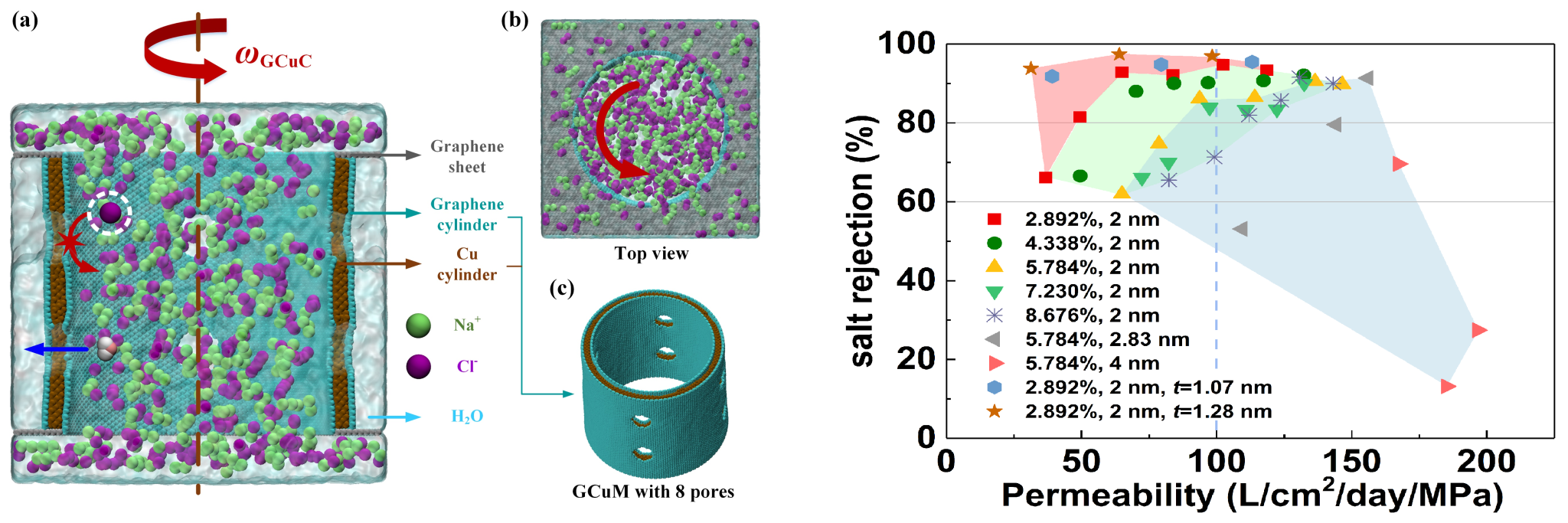 该论文创新性提出采用带有“大孔”(大于水合离子直径)的旋转多孔石墨烯-铜复合膜(GCuM)实施反渗透滤盐,理论和数值上实现了156   L/cm2/day/MPa的超高渗透率时大于90%的离子截留率,比已有的反渗透膜研究和新型商业滤盐反渗透膜高2.6 - 1000该成果从边界滑移角度解释了滑移速度对反渗透效率的影响规律,并从分子机理(水合离子、能障)方面明确了边界滑移速度对盐截留的作用机制。此外,进一步推导了针对GCuM的“时间维度选择性”理论,解释了孔隙尺寸、膜厚度和水合离子质量对高渗透性和滤盐性的影响机制。研究成果继“Surface   slip on rotating graphene membraneenables the temporal selectivity that   breaksthe permeability-selectivity trade-off”(ScienceAdvances   6,eaba9471 (2020))之后,进一步阐明了“时间维度离子选择性”机理,为反渗透海水淡化装备设计提供工程参考,将在海水淡化、污水处理等领域发挥重要指导作用。
