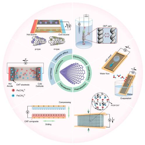 随着全球变暖加剧,节能减排和碳中和的理念越来越深入人心,因此开发新型能量收集技术变得越来越迫切。近年来,各种能源收集技术层出不穷。其中,利用电化学、水伏效应、摩擦电、压电和热电效应的纳米发电机技术发展迅速。碳纳米管(CNT)是一种具有高电导率\高热导率、优异的电化学和机械性能的功能纳米材料,在纳米发电机领域中广泛应用。然而,基于CNT的纳米发电机技术的原理还不甚清楚、性能还有待提高。