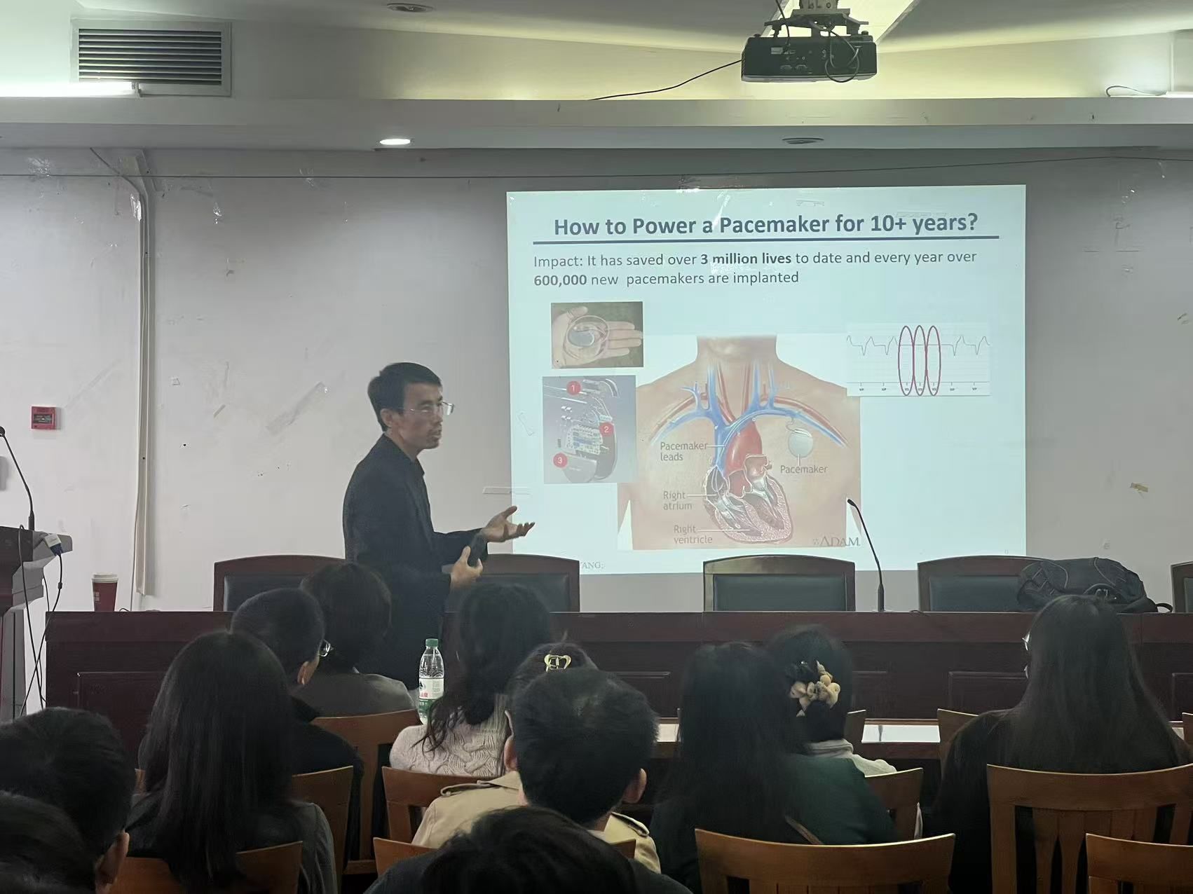 杨征保副教授从其团队在能量收集和无线供电方面的最新研究进展出发,指出研究的长远影响、可行性以及新颖性,是优秀课题的必要属性。杨老师通过自身的科研经历告诉在场的同学们,做科研要保持乐观健康的心态,并针对报告中的内容与师生展开了深入的探讨。杨征保副教授的报告给在场师生非常好的启发。