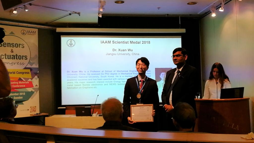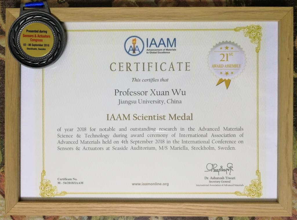 2018年9月4日,在瑞典斯德哥尔摩召开的“2018年传感器与执行器国际学术大会(2018 Sensors & Actuators Congress)”上,我院吴旋教授荣获国际先进材料协会(International Association of Advanced Materials,IAAM)颁发的“2018年度杰出科学家奖(IAAM Scientist Medal)”,以表彰他在先进材料科学与传感器技术领域取得的突出研究成就。