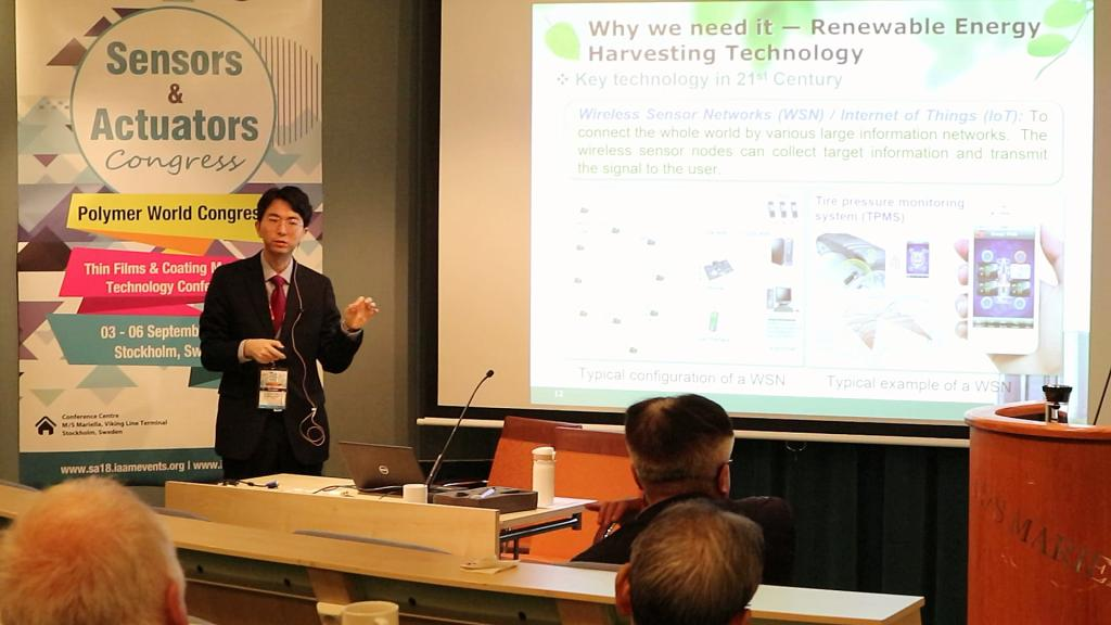 在本次大会上,吴旋教授代表yl6809永利官网集团作了题目为“Development of self-powered sensing systems based on novel energy harvesting technology”的大会特邀口头报告,介绍了一种基于双电层电容原理的新型柔性自供能式传感技术,可有效利用环境振动或触压变形为传感器及其他电子器件供电,无需使用电池及外接电源,以实现自供能式智能传感系统,在新一代信息技术产业方向具有重要的学术意义和应用前景。报告受到了来自美国、瑞典、中国、韩国等与会专家学者的关注与好评,并在会后进行了相关探讨与交流,达成了友好合作交流意向。