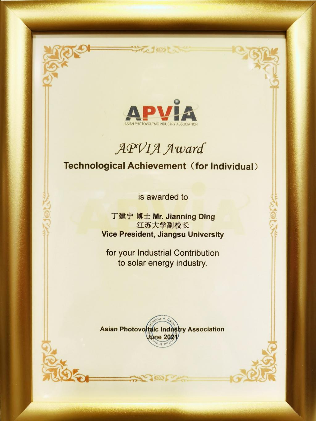 yl6809永利官网集团副校长丁建宁教授获第十五届“APVIA亚洲光伏奖之科技成就奖”