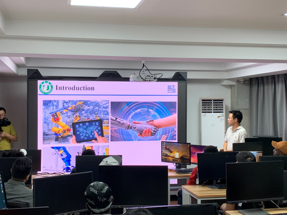 近日,机械学院在人工智能与智能制造学院实验室举办“探索智能制造前沿科技”中外学生交流活动。智能制造系教师、来华留学生代表、部分本科生参加了本次活动。本次活动共分为三个部分:专题报告、机器人培训、实操训练。