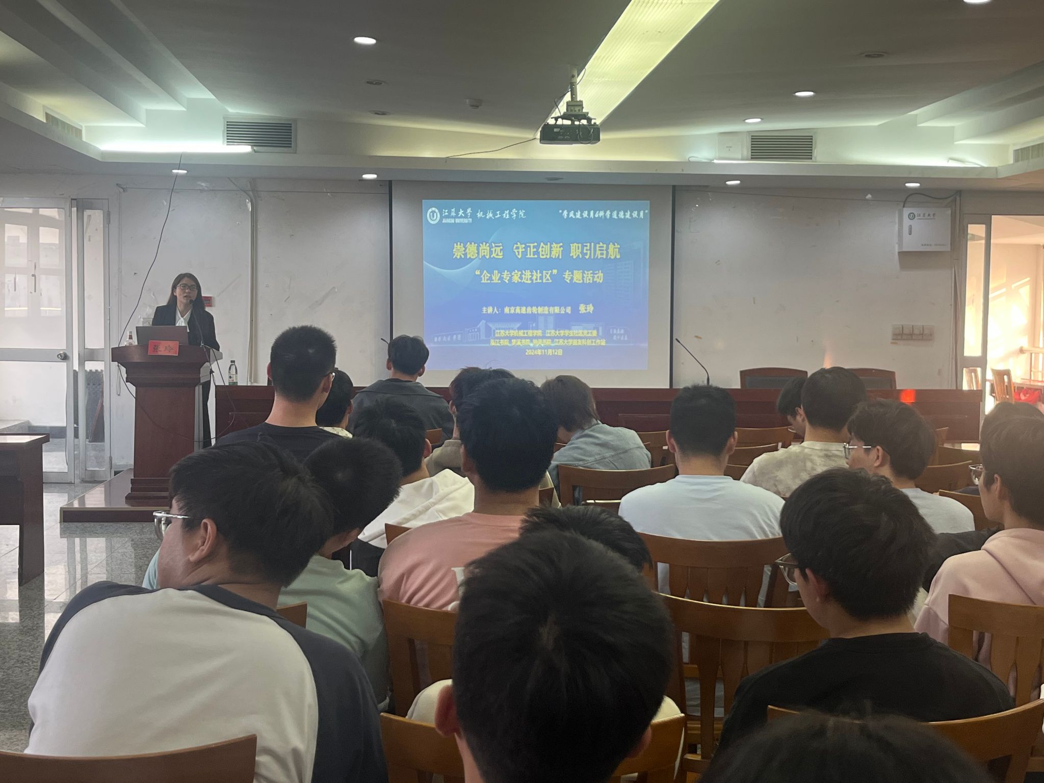 11月12日,yl6809永利检测中心联合yl6809永利官网集团学生社区党工委、泓江书院、梦溪书院、钟灵书院、yl6809永利官网集团益友科创工作站等平台在机械楼七楼报告厅开展举办“企业专家进社区”专题活动。此次活动以“崇德尚远,守正创新,职引启航”为主题,邀请南京高速齿轮制造有限公司招聘负责人张玲主讲,yl6809永利检测中心学工办副主任叶昕主持。
