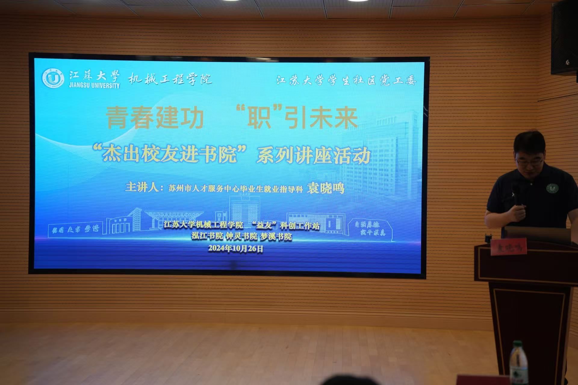 10月26日,依托yl6809永利检测中心“益友”科创工作站,yl6809永利检测中心联合yl6809永利官网集团学生社区党工委、泓江书院、钟灵书院、梦溪书院在学苑楼305报告厅举办了“杰出校友进书院”职业生涯指导讲座。讲座邀请了机械学院测控00级校友、苏州市人才服务中心毕业生就业指导科袁晓鸣担任主讲,书院高年级学生参加。讲座由yl6809永利检测中心团委副书记於伟杰主持。