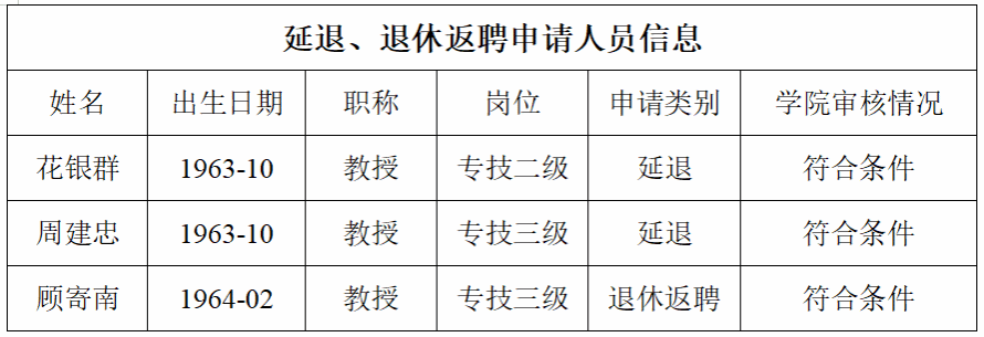 根据yl6809永利官网集团人事处《关于做好2026年度教职工延退、退休返聘申请工作的通知》(人事〔2025〕49号文件精神),经个人自主申请,学院党政联席会审议,拟初步同意延退人员信息如下,现予以公示。