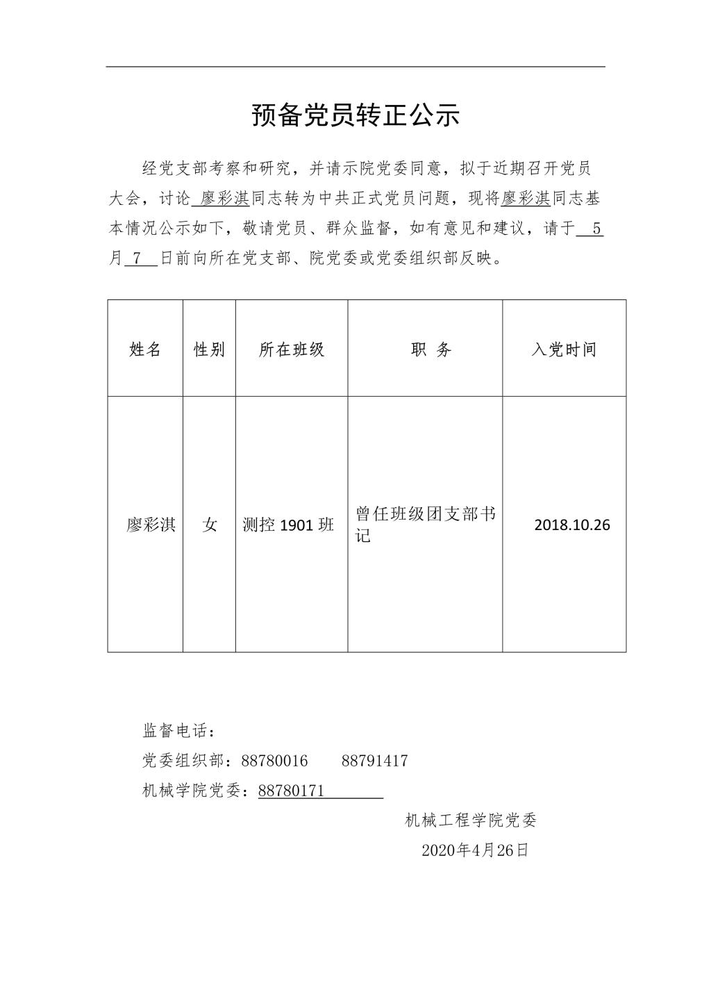 机械学院预备党员转正公示2020.4.26