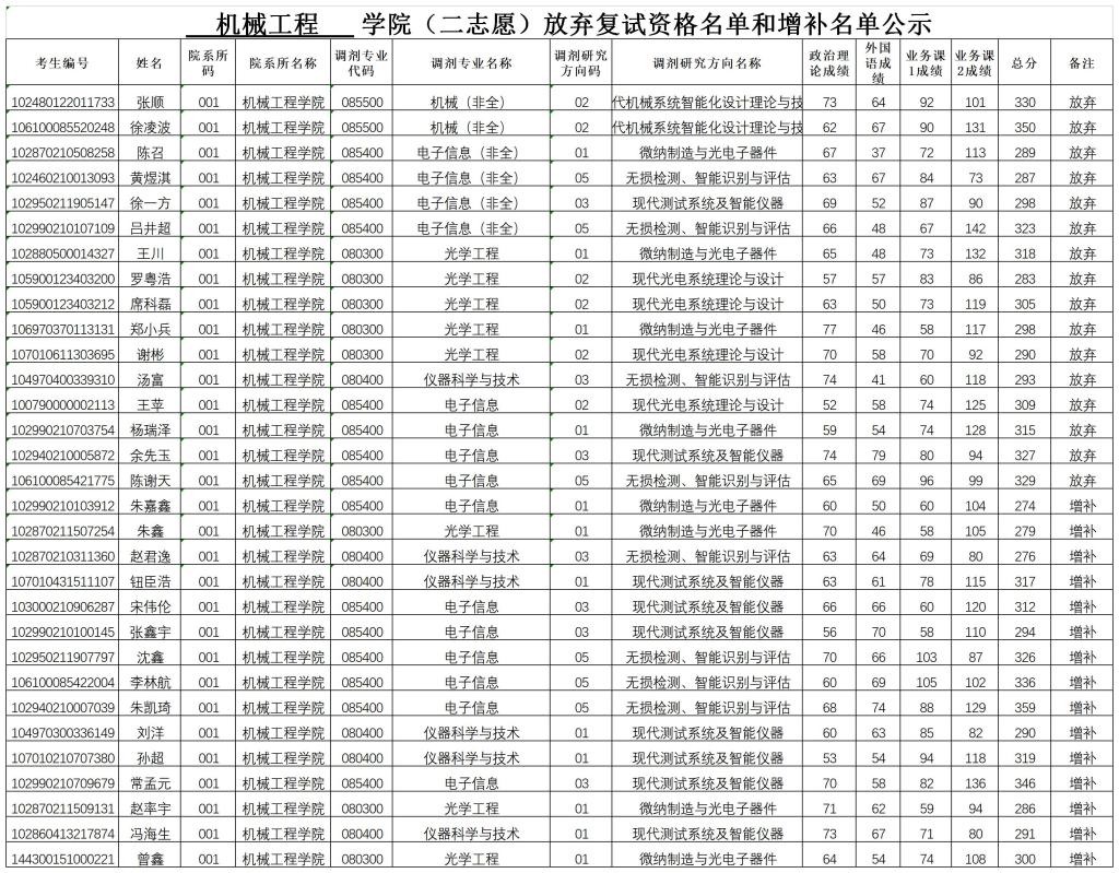 机械学院二志愿调剂考生放弃名单和增补名单公示