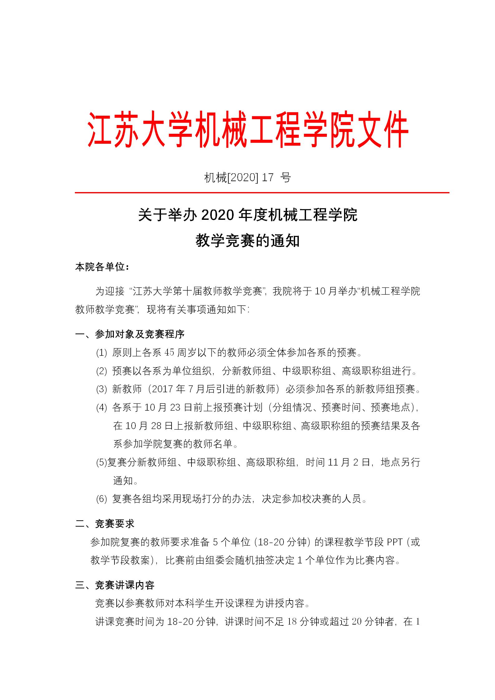 关于举办2020年度yl6809永利检测中心教学竞赛的通知(机械[2020] 17 号)