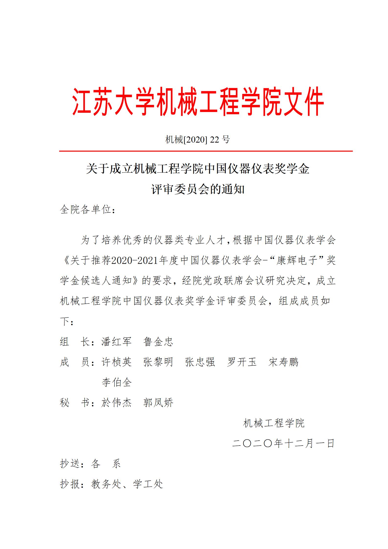 关于成立yl6809永利检测中心中国仪器仪表奖学金评审委员会的通知