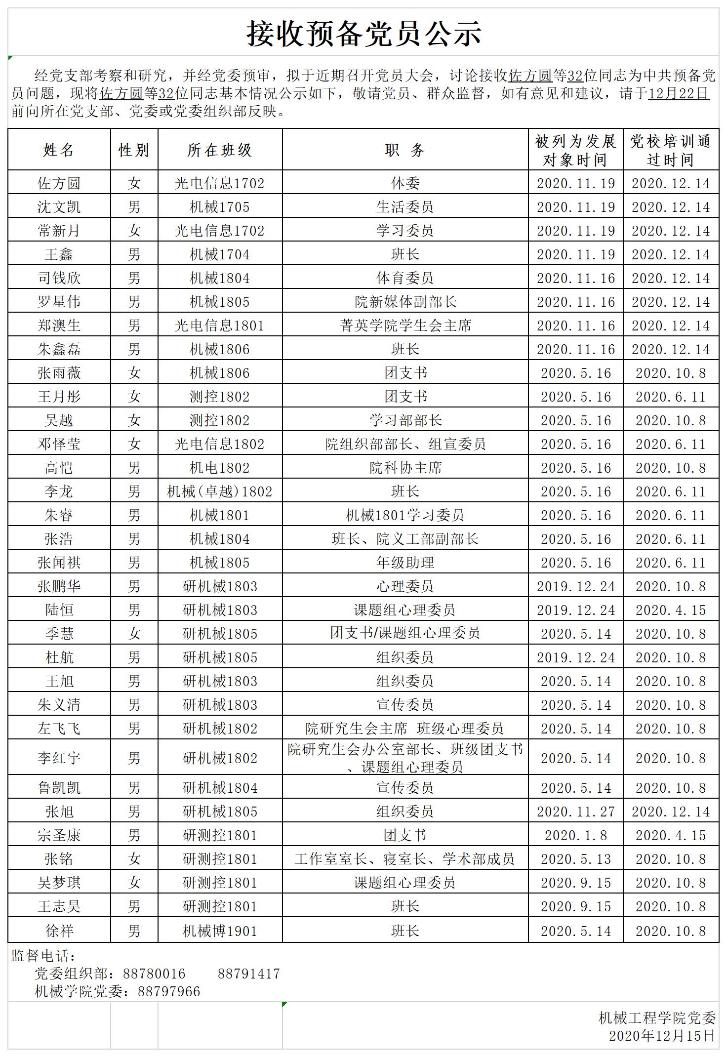 机械学院2020年下半年接收预备党员公示