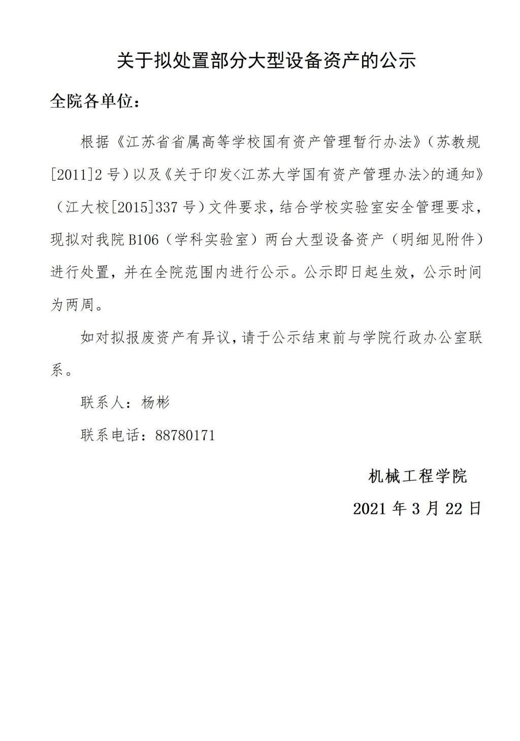 关于拟处置部分大型设备资产的公示