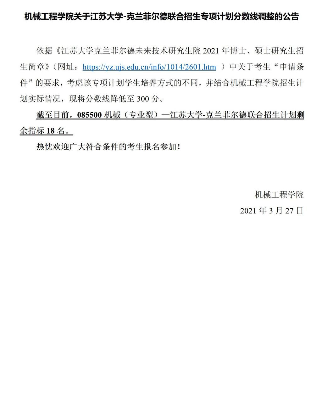 机械学院关于yl6809永利官网集团-克兰菲尔德联合招生专项计划分数线调整的公告.docx