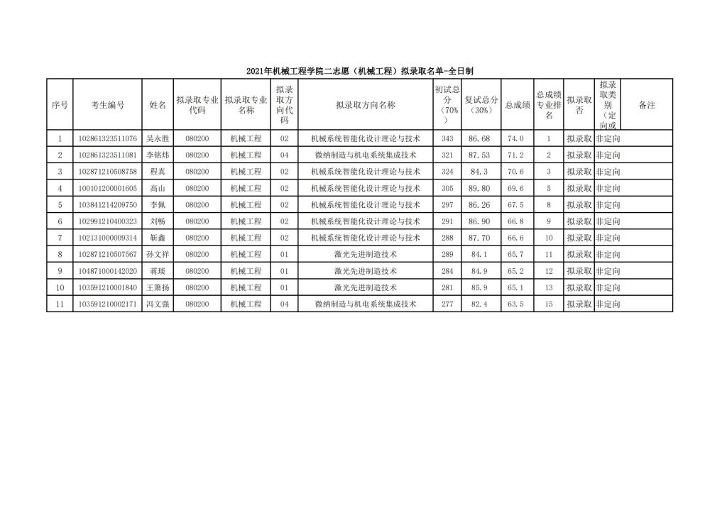 2021年yl6809永利检测中心二志愿(机械工程)拟录取名单-全日制-3月28日