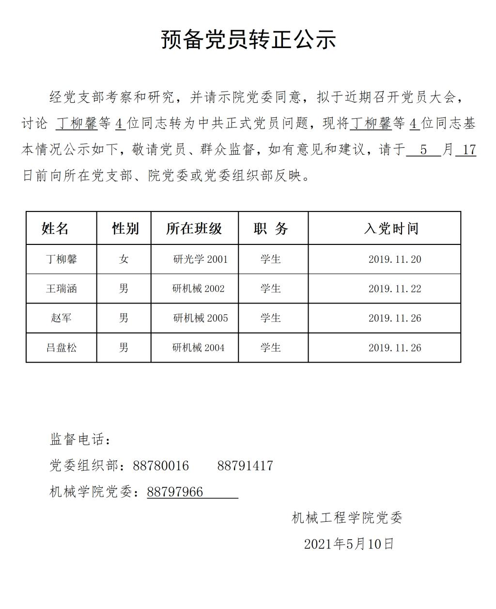 机械学院预备党员转正公示 新生延迟6个月转正(2021年5月10日)