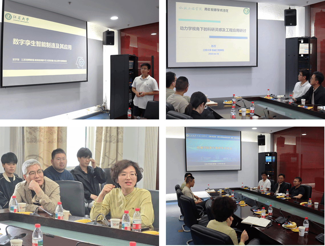 梁宇琛特聘教授围绕故障诊断、动态调度、边缘计算、激光熔覆和激光冲击五方面内容,从机理建模与数据驱动方法等方面详细展开介绍,并分享了如何将博士研究课题与工作后课题组方向进行融合的经验与思考。孙万教授从非线性动力学出发,介绍微分方程理论在流致振动俘能、工程机械振动抑制及多物理场耦合调控中的广泛应用,从机械结构、数学模型和工程应用三方面详细介绍,为深化机理认知、突破工程瓶颈提供新视角。活动进行过程中,师生们以两位教授的学术成果为引子,交流了科研选题、研究方法、科研灵感、研究生培养等内容。作为机械学院资深教授,符永宏老师一直关心机械学院发展,关心学院学科发展,他充分肯定了学院青年教师学术论坛对科研型学院的重要性,肯定了学院青年教师的研究成果和创新思维,从制造业发展现状出发,对报告进行了精彩点评,提出了建议。叶云霞副院长从学院优势方向发展、研究团队建设角度对老师们的科研工作以及未来努力方向提出了建议。