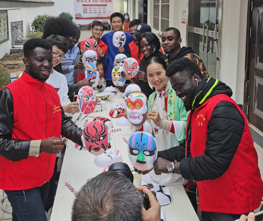On the morning of November 17th, Chinese volunteers from Jiangsu University and seven international student volunteers went to Zhenjiang Taigushan community to experience and learn traditional Chinese opera culture. Volunteers worked with the community to draw opera facial makeup and learn the meaning behind facial makeup. Facial makeup is a form of painting expression used by opera artists to communicate with audiences, and an art form that uses exaggeration to express life.Facial makeup art is a comprehensive art form, as well as a materialized form of Chinese traditional culture and aesthetic concepts.In the era of close global cultural exchanges, facial makeup art should and is easier to promote to the world.It is also necessary to actively try and innovate like volunteers to make Chinese culture full of vitality.