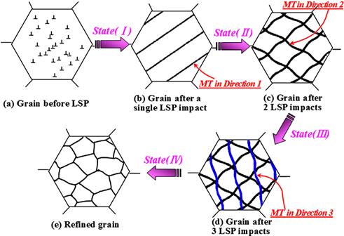 Schematic illustration showing micro-structural evolution of the top surface induced by different numbers of Laser shock processing impacts