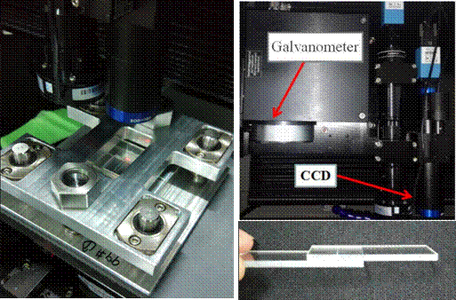 Typical equipment and specimen of ultra-short pulse laser transmitted welding of glass