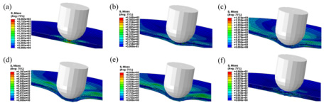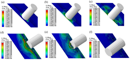 Fig. 2 Ballistic penetration process of the flat projectile in the 3D braided composite target plate (a) t=1µs (b) t=3µs (c) t=6µs (d) t=8µs (e) t=11µs (f) t=40µs
